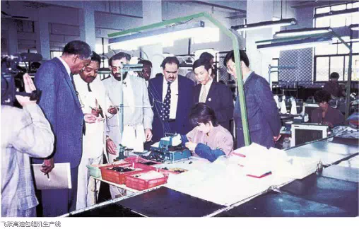 上圖為外國(guó)客人參觀飛躍高速包縫機(jī)生產(chǎn)線。