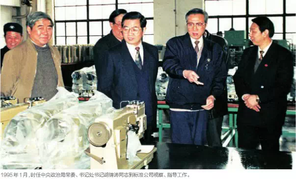 1995年,行業(yè)規(guī)模企業(yè)總產(chǎn)值43.9億元,年產(chǎn)縫紉機(jī)713.1萬(wàn)臺(tái),其中工業(yè)縫紉機(jī)產(chǎn)量171.7萬(wàn)臺(tái),全行業(yè)總出口2.5億美元。下圖為1995年1月,時(shí)任中央政治局常委、書記處書記胡錦濤同志到標(biāo)準(zhǔn)公司視察。