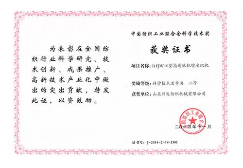 2014年11月25日,“紡織之光”2014年度中國紡織工業(yè)聯(lián)合會(huì)科技教育獎(jiǎng)勵(lì)大會(huì)在北京召開,日發(fā)“RFJW10型高速低耗噴水織機(jī)”獲得科學(xué)技術(shù)進(jìn)步二等獎(jiǎng)。