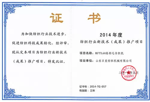 除此之外,RFJW10型噴水織機(jī)、RFRL30型高速劍桿織機(jī)、RFRL31節(jié)能型高速劍桿織機(jī)、RFTL60高檔毛巾織機(jī)均被中國紡織工業(yè)聯(lián)合會(huì)認(rèn)定為2014年度紡織行業(yè)新技術(shù)(成果)推廣項(xiàng)目。