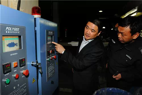 圖為:柯橋區區委書記徐國龍對柯巖街道部分印染企業定型機“靜電”二級廢氣處理裝置的運行情況進行突擊檢查。
