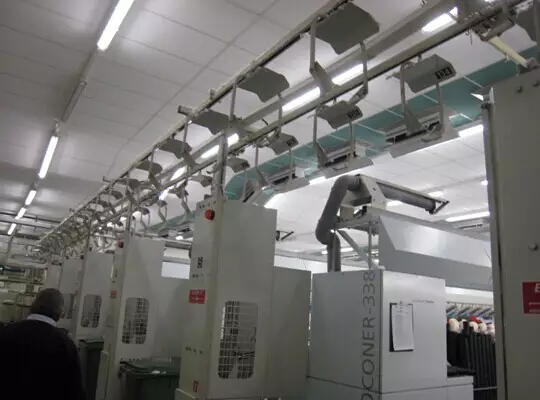 (圖為西班牙ROYO紡紗廠內(nèi)部) 不久前,網(wǎng)上盛傳一家擁有全自動化生產(chǎn)線的西班牙紡紗廠的生產(chǎn)視頻。該廠全部為自動化設(shè)備,清梳聯(lián)、粗細(xì)聯(lián)、細(xì)絡(luò)聯(lián),工序之間由空中軌道運輸半成品、成品,絡(luò)筒后的筒紗也是由運輸線送到打包間自動打包。紡部生產(chǎn)用工萬錠僅為5人,其中細(xì)紗絡(luò)筒工序3人,清花前紡1人,代班1人。