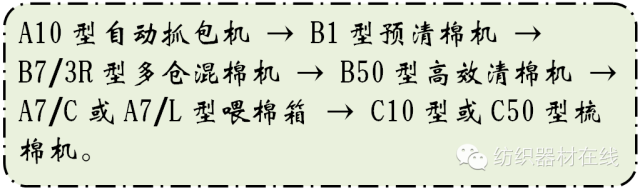 從20世紀60年代開始,日本清梳聯在紗錠應用中的比重逐年上升,1970年為7.3%,到1985年末,清梳聯比重已經上升到47.8%。這一時期為代表的是日本豐田株式會社清梳聯設備,其流程配置為: